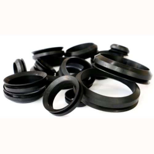 Rubber V-Rings for shafts requiring a dynamic seal (primary or back-up) in the axial direction. The body of V seals rotates with the shaft and holds itself in position by its elastic fit on the shaft. Sealing is produced by the contact between the lip and the counterface. Additionally, the V Series rings have good sealing action when the shaft is eccentric and/or there is some misalignment. Combined with radial shaft seals, these axial face seal designs provide excellent excluding characteristics against all types of liquids, greases, oils, dirt, and other foreign materials. V-Rings are available in both Buna N and Viton.